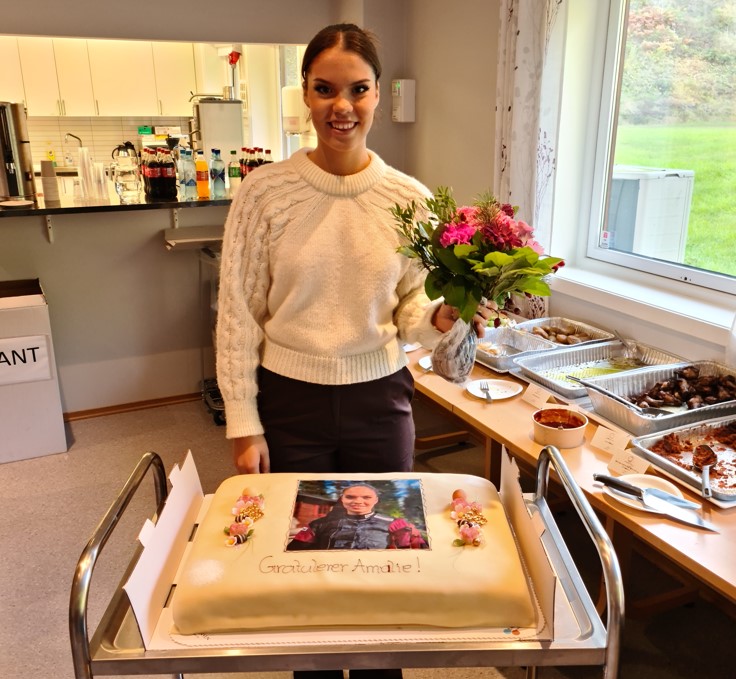 Etter skytingen var det invitert til middag for skyttere med foresatte. Meget gledelig var lokalet fylt opp og det ble en hyggelig stund. Etter middag var det premieutdeling fra dagens skyting, samt klubbmesterskapene i bane, felt og 15m. Denne glimrende anledningen ble benyttet til å gjøre stas på Amalie Mortensen Torbal som vant kl. J på felten i Landsskytterstevnet. For anledningen var desserten er stor kake med bilde av Amalie.