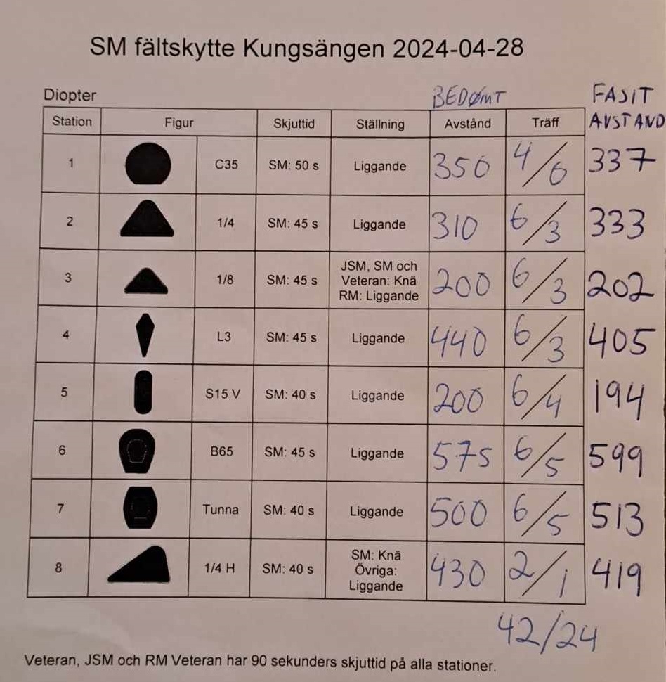 «SM gikk søndag 28. april i Kungsängen skytefelt nordvest for Stocholm. Jeg og Lars Bugge deltok fra Norge. Vi fikk som vanlig bryne oss på en morsom og utfordrende feltløype med totalt 48 skudd fordelt på 8 standplasser. Figuropplegg, mine bedømte og de i ettertid oppgitte avstandene og mine resultater finner du i bildet nedenfor. Resultatene finnes foreløpig kun som bilder av utskrifter på Facebook-sidene til Länsskytten Stockholm, som var arrangør. Jeg og Lars er tatt ut av listene, men med 42/24 hadde jeg blitt nummer 5. Vinneren og de to han slo i omskyting hadde 43 treff.